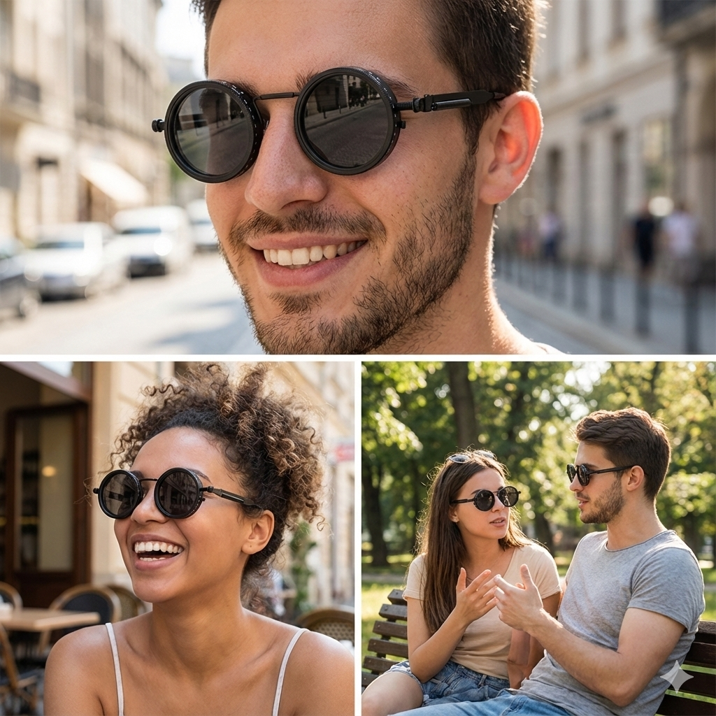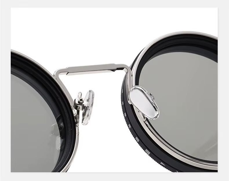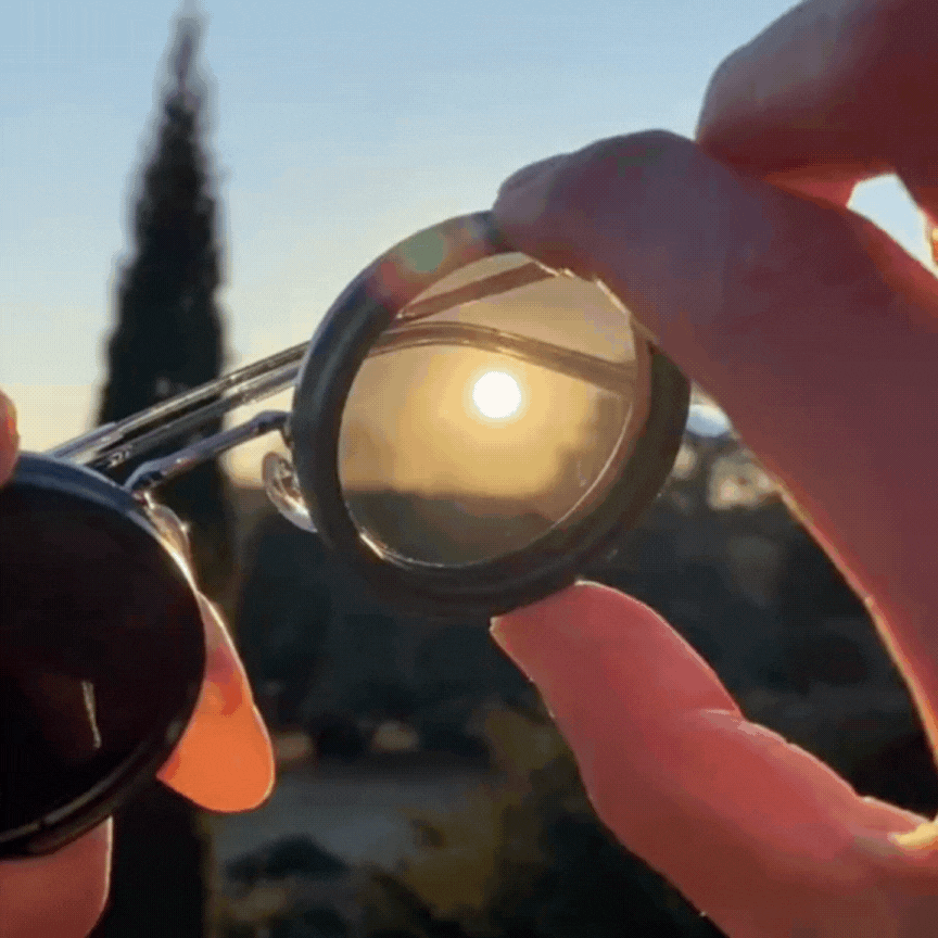 Simply rotate the outer rim of the lens frame. The mechanism allows for smooth, stepless adjustment from light to dark instantly